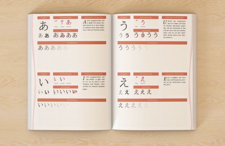 14 Lektionen • 213 Seiten • Hiragana + Katakana komplett • kulturelles Wissen • Übungen • Vokabeln